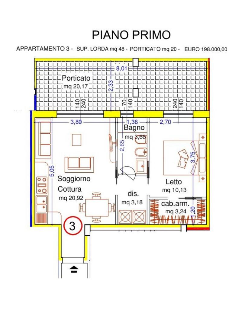 Al primo piano, un elegante bilocale si distingue per l'architettura moderna ed i materiali di alta qualità. Si compone di un ampio soggiorno e cucina in open-space, camera da letto con cabina armadio, bagno ed un'ampia terrazza di oltre 20mq.