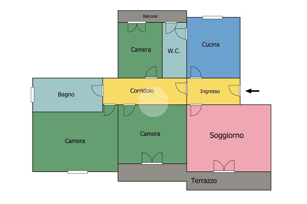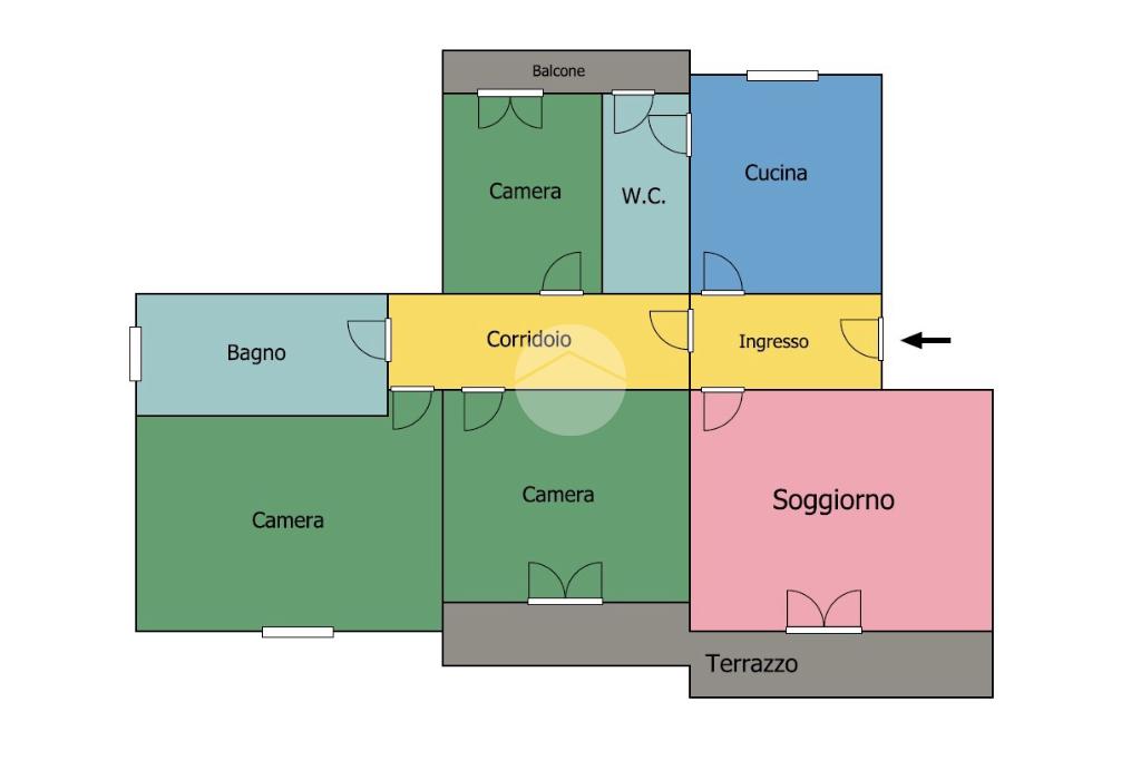 L’appartamento, sito al terzo piano di una palazzina dotata di ascensore, ci accoglie in un comodo disimpegno che permette l’accesso ai diversi ambienti.
